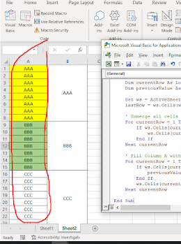 When you run this macro, it will unmerge any merged cells in Column A and then fill Column A with the last non-empty value from Column B for each row. This is useful when you want to fill gaps in your data based on the last non-empty value in another column.